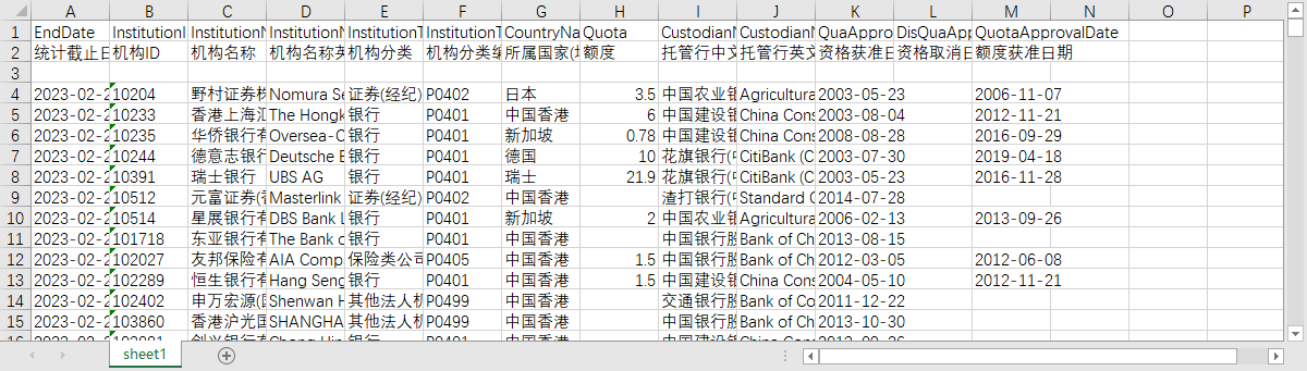 统计截止日期 机构ID 机构名称 机构名称英文 机构分类 机构分类编码 所属国家(地区) 额度 托管行中文名 托管行英文名 资格获准日期 资格取消日期 额度获准日期