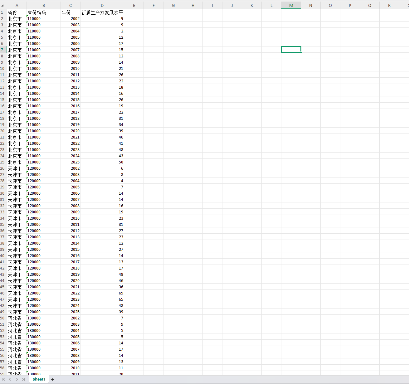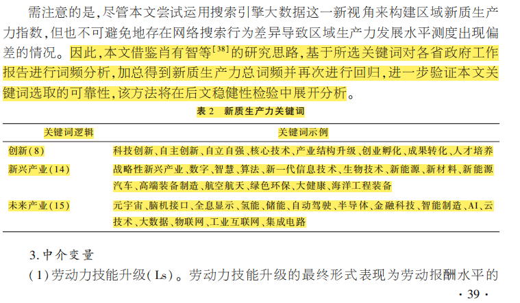 指标说明:基于文献中列示的关键词对各地区工作报告进行词频分析,加总后得到新质是生产力总词频,用以衡量地区新质生产力发展水平。