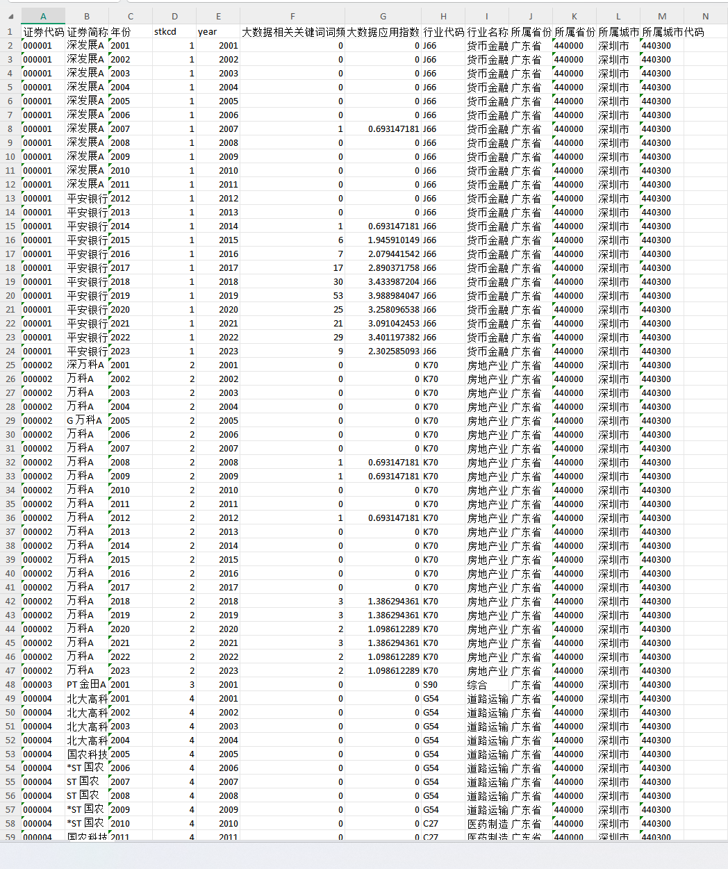 证券代码、证券简称、年份、stkcd、year、大数据相关关键词词频、大数据应用指数、行业代码、行业名称、所属省份、所属省份代码、所属城市、所属城市代码