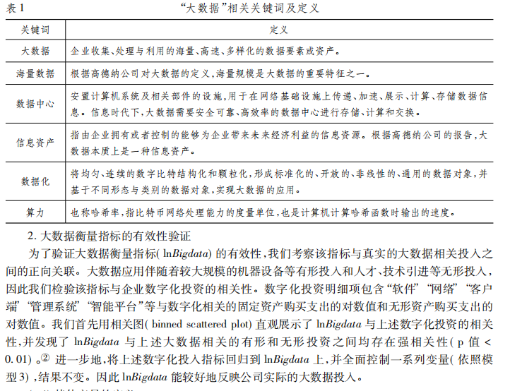 本研究借鉴张叶青(2021)的研究方法,采用文本分析法对公司年报中的大数据应用程度进行量化评估。具体而言,通过统计年报中与大数据相关的关键词出现频次来构建衡量指标。在关键词选取方面,综合参考了学术文献、政府政策文件以及行业研究报告等多个权威来源。