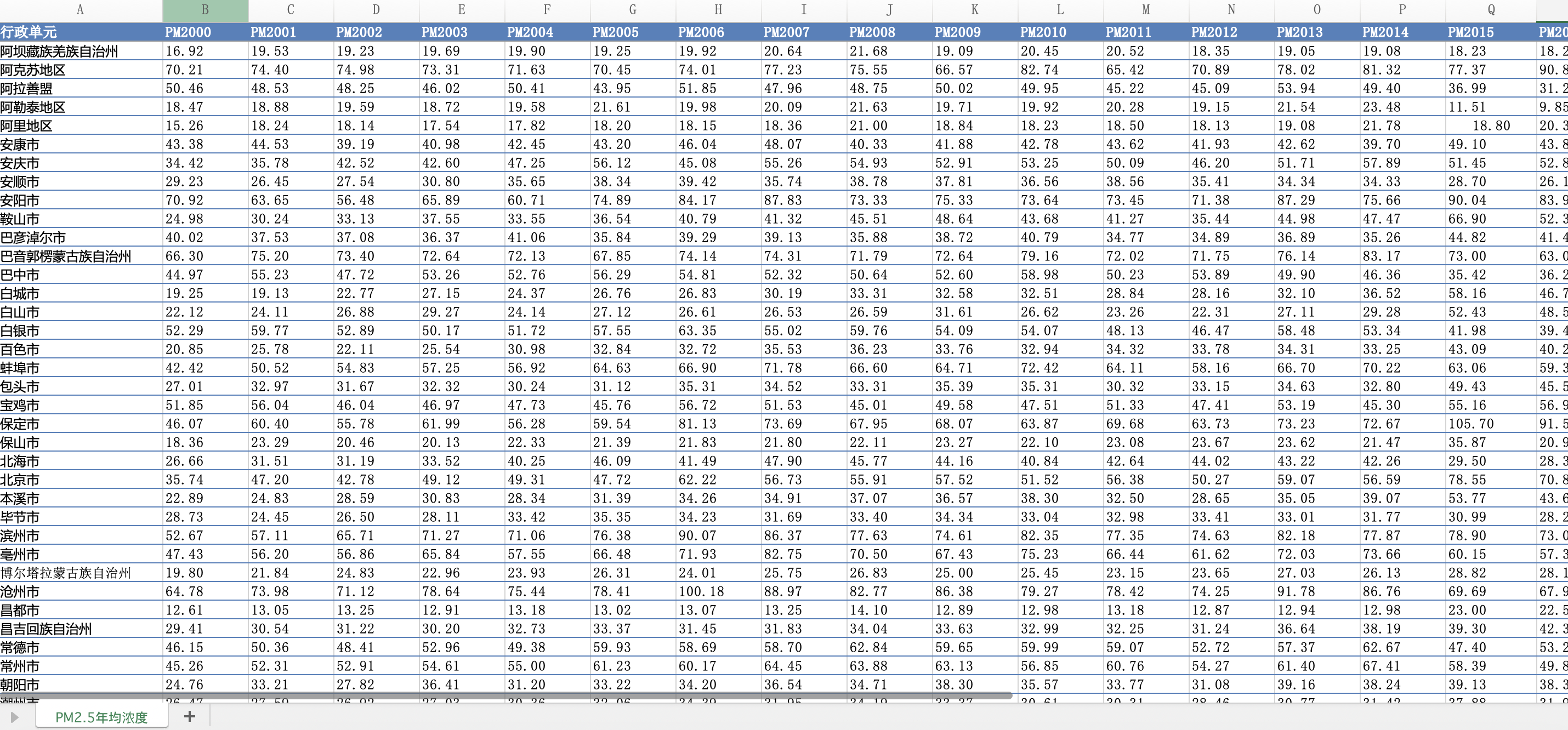 数据用途与研究背景PM2.5是评估空气污染与公共健康风险的重要指标,具有高度时空异质性。本数据集通过融合全球PM2.5浓度栅格产品与中国国家空气质量监测站点数据,构建出2000–2024年中国342个地级市的年均PM2.5浓度序列,适用于生态环境政策评估、空气治理成效分析、城市可持续发展研究等多类场景。
