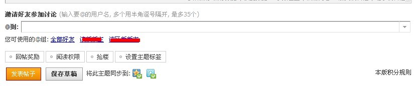 如题,论坛技术人员经过努力,开发了@功能,仿微博,今后论坛发帖就可以直接邀请好友参加讨论了。此功能就在发表帖子的下方位置,“发表帖子”键上方,欢迎测试并回复补充不足之处,我们将尽力修改,争取让坛友们的交流更加顺利。谢谢!