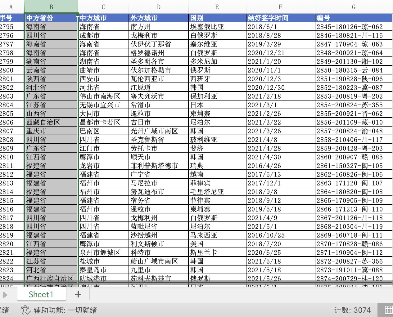 该数据为非定期面板数据,各城市结好年份不一,适合时间序列追踪与地理分布分析。