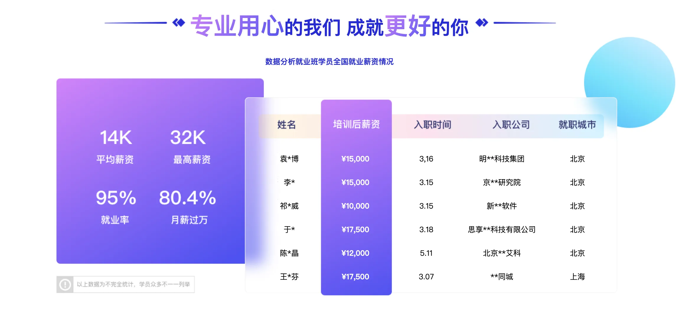 除了优质师资团队外,我们还提供班主任和助教答疑服务、职业规划团队的指导,为您顺利进入企业就业铺平道路。无论您是零基础学生、转行人士,还是已从事数据相关工作多年的专业人士,我们都欢迎您的加入。立即踏上数据分析之旅,掌握数据在各行业的应用,提升数字化工作效率,实现个人职业发展的新突破。快来报名吧,迎接挑战,赢得未来的辉煌!