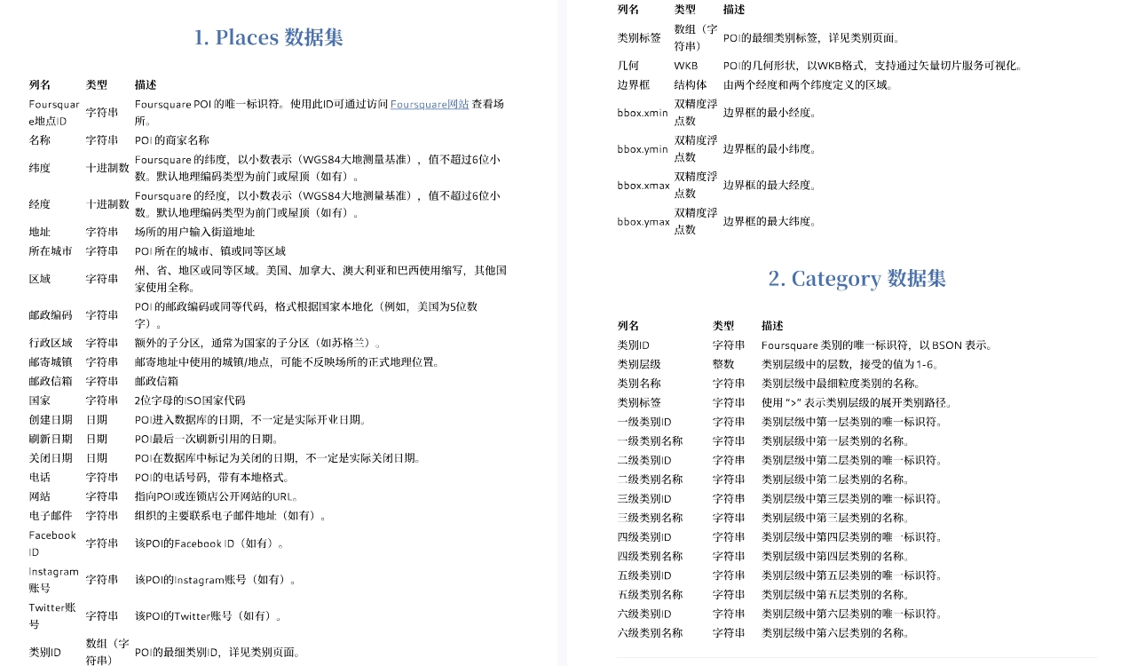 POI数据集是一种结构化的地理信息集合,涵盖了体育与娱乐、餐饮、零售、艺术与娱乐、商业与专业服务、健康与医疗、地标与户外、社区与政府、旅行与交通、活动及夜生活场所等各类场所。来自Foursquare 平台,包括2003-2024年全球各国的兴趣点数据,样本总量1亿+