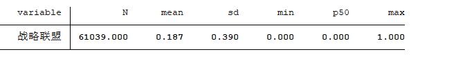 战略联盟(Alliance)的衡量方式参考黄勃等 (2022)。首先,根据标题中是否含有“战略联盟”“战略合作”“联盟合作”“企业联盟”“企业联合”等关键词,筛选出与战略联盟相关的公司公告,再通过人工阅读的方式获取企业参与战略联盟的具体信息,包括联盟对象、联盟方式、是否成立合资子公司等。其次,根据战略联盟后续合作进展,删除联盟终止、失败、停止实施等情况的数据。然后,考虑到企业参与战略联盟具有连续性,即在一段时间内参与合作,且部分战略联盟合作公告并未披露合作时长,本文参照陈文瑞等 (2021) 的做法,将联盟合作的有效期设置为 3 年。 最后,根据对战略联盟合作公告的整理结果,设置战略联盟哑变量,若企业当年参与了战略联盟或仍处于战略联盟的合作期限内则取值为 1,否则为 0。
