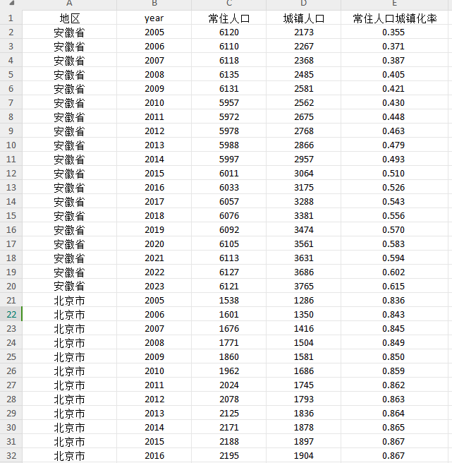 2005-2023年全国各省、地级市、县区(2022)城镇化率面板数国家统计局23日发布的新中国75年经济社会发展成就系列报告显示,2023年末我国常住人口城镇化率达66.16%,比1949年末提高55.52个百分点,年均提高0.75个百分点。城镇化率是衡量城镇化发展水平的重要指标,常住人口城镇化率主要反映人口在城镇的聚集程度,是指人口的城镇化程度。受户籍制度影响,当前我国常住人口城镇化率不能很好地客观反映产业结构、公共服务和基础设施等情况,仅这一指标不能全面衡量新型城镇化进程。