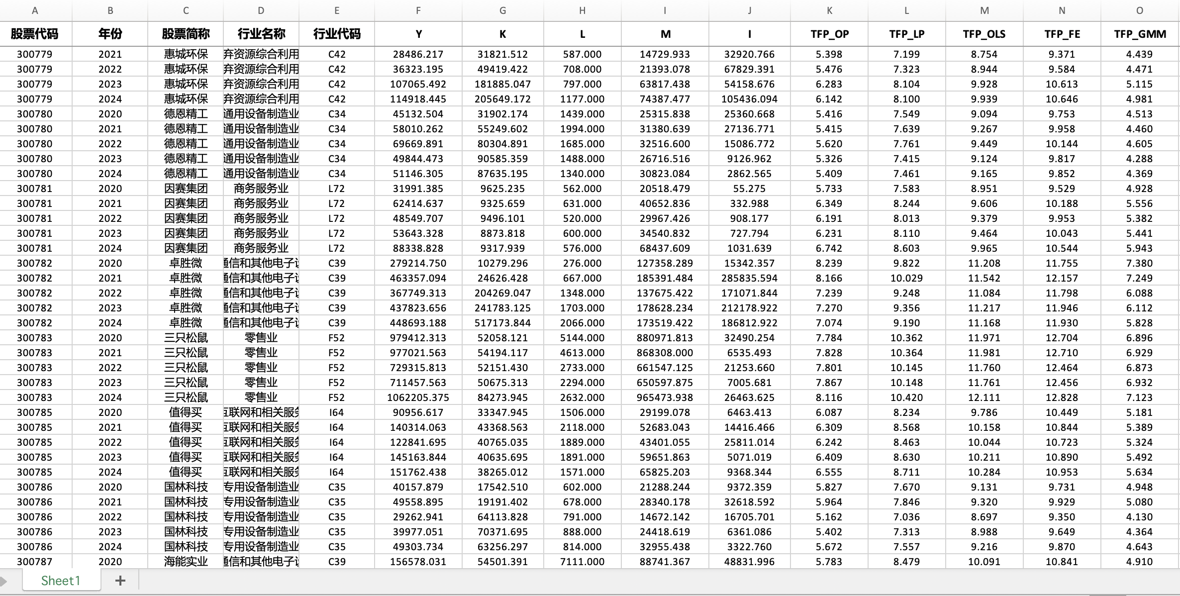一、数据背景与应用价值全要素生产率(Total Factor Productivity, TFP)是衡量企业在不增加投入(如劳动、资本和中间品)的前提下,通过技术进步、组织优化、管理提升等手段提高产出的能力。它被广泛视为反映企业核心竞争力、创新效率和资源配置水平的关键指标,亦是现代企业研究中不可或缺的绩效变量。