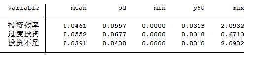 对以上Richardson模型进行OLS得到的残差来衡量投资效率,残差大于0表示过度投资,且值越大,过度投资程度越大,残差小于0表示投资不足,且值越小,过度不足程度越大。通常最后构建三个变量:投资效率(残差绝对值),过度投资(残差绝对值,残差大于0的样本),投资不足(残差绝对值,残差小于0的样本)