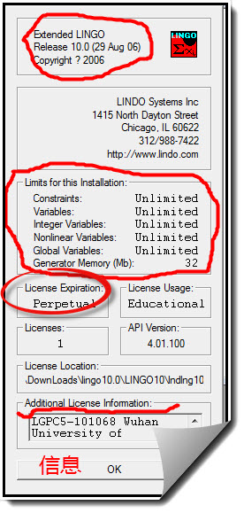 第一个版本是 LINGO 10.0, 这个版本是英文的,没有任何功能限制,使用时间也是无限的。软件使用界面和软件信息截图如下:(解压即可使用)