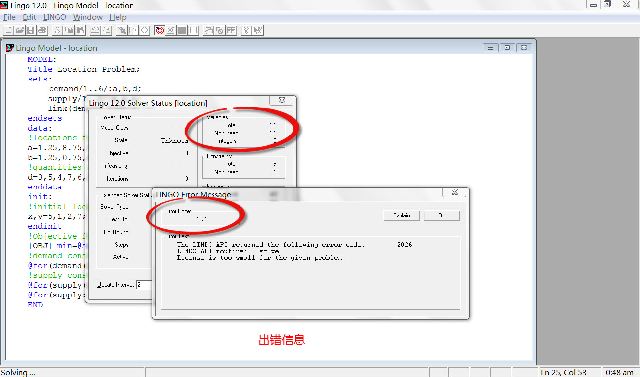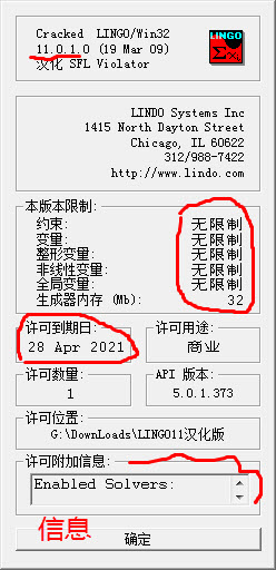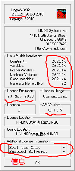 第四个版本是LINGO 12.0。此版本网上许多地方都说破解了,而且安装后查看信息时也显示版本限制低(可求得很多变量的问题),然而实际上却不行,本人在求解一个全局最优解时(问题为谢金星等主编的优化建模与LINGDO/LINGO软件书中第三章的寻址问题),出现错误。错误与软件信息截图如下:(解压即可运行)