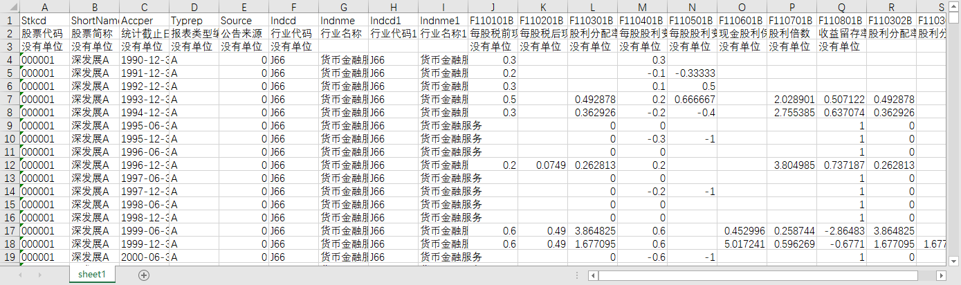 股票代码 股票简称 统计截止日期 报表类型编码 公告来源 行业代码 行业名称 行业代码1 行业名称1 每股税前现金股利 每股税后现金股利 股利分配率 每股股利变动值 每股股利变动比率 现金股利保障倍数 股利倍数 收益留存率 股利分配率2 股利分配率3