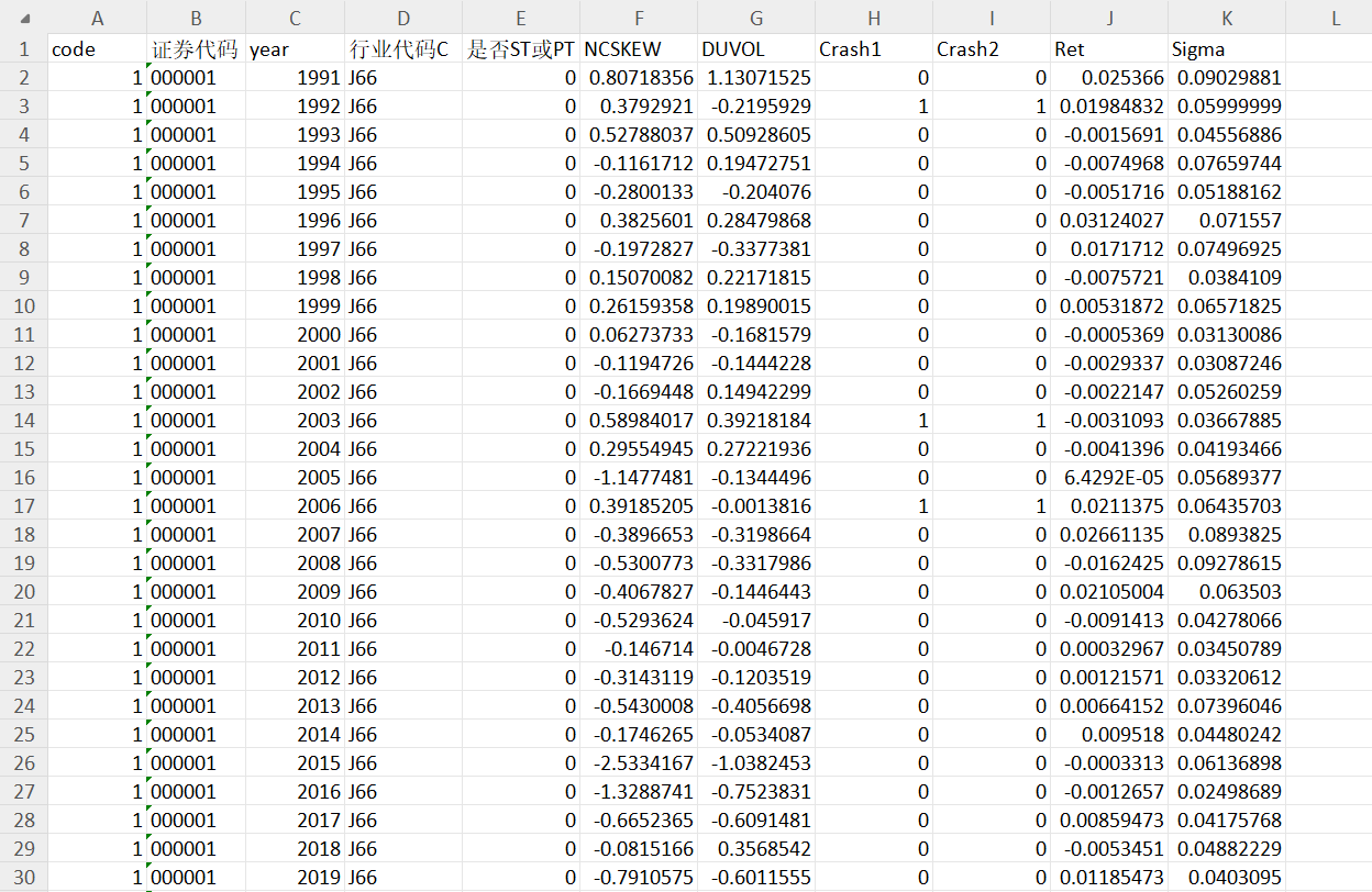 该变量的数值大小反映股票收益分布左偏的程度,股票收益越左偏,崩盘风险越大。