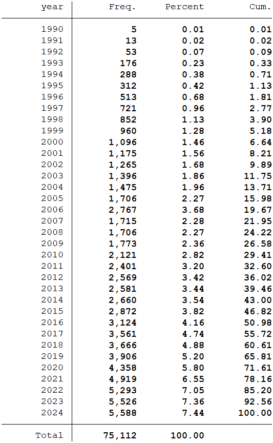 样本选择:全部A股1990-2024年数据(“日个股回报率文件”和“综合日市场回报率文件”在数据库中均是从1990-12-19开始,所以数据起点为1990年)