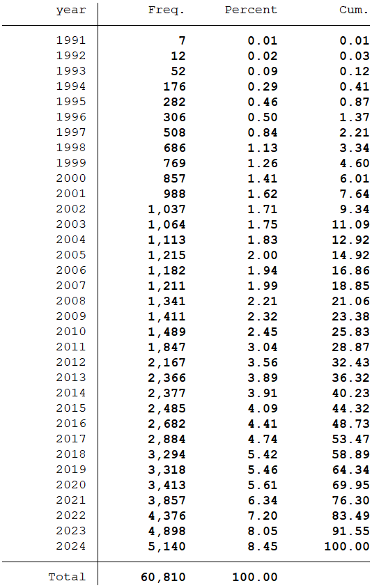 样本选择:全部A股1991-2024年数据(初始数据的起点为1990年,经过处理之后的数据起点为1991年)