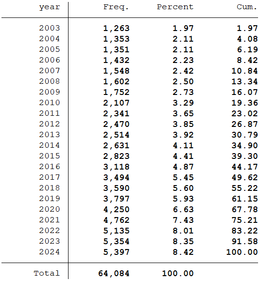 样本选择:全部A股2003-2024年数据(“股份质押、冻结或托管情况”文件在数据库中是从2003年开始,所以数据起点选择为2003年)