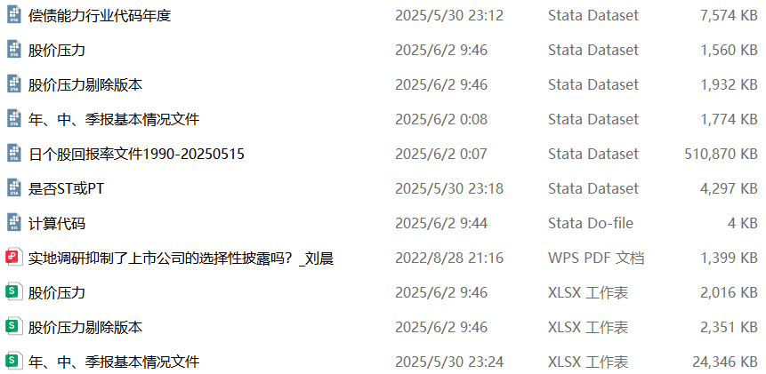 版本2:与大多数文献相同,剔除了金融行业的样本和当年年末被ST、*ST或PT的上市公司,文件名为“股价压力剔除版本”