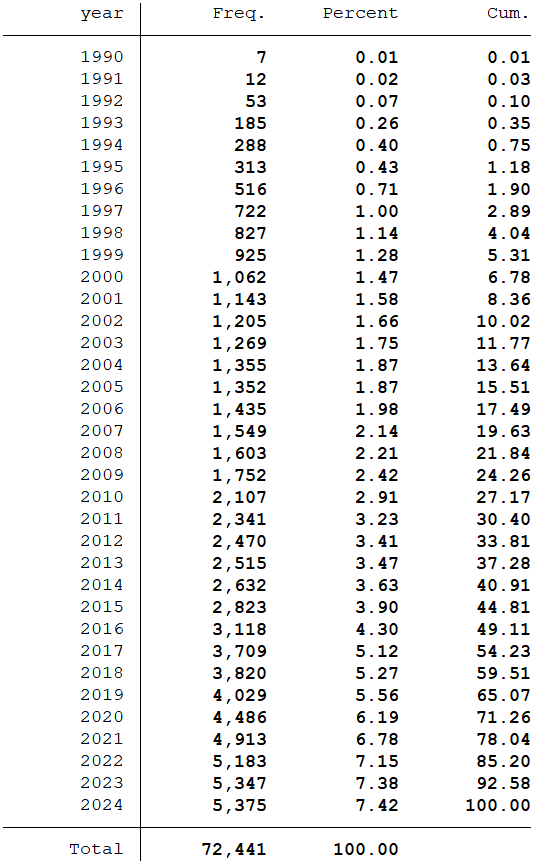 样本选择:全部A股1990-2024年数据(“日个股回报率文件”在数据库中是从1990-12-19开始,所以数据起点选择为1990-12-19)