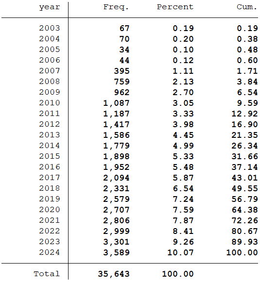 样本选择:全部A股2003-2024年数据(“高级管理人员前三名薪酬总额”在数据库中是从1999年开始,经过处理之后的数据起点为2003年)