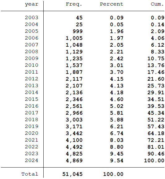 2.数据说明样本选择:全部A股2003-2024年数据(“第一大股东持股比例”数据是从2003年开始,所以数据起点选择为2003年)