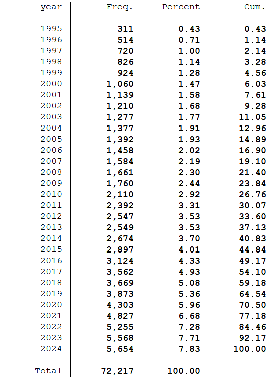 样本选择:全部A股1995-2024年数据(“交易信息总表”在数据库中是从1995-02-21开始,所以数据起点为1995年)