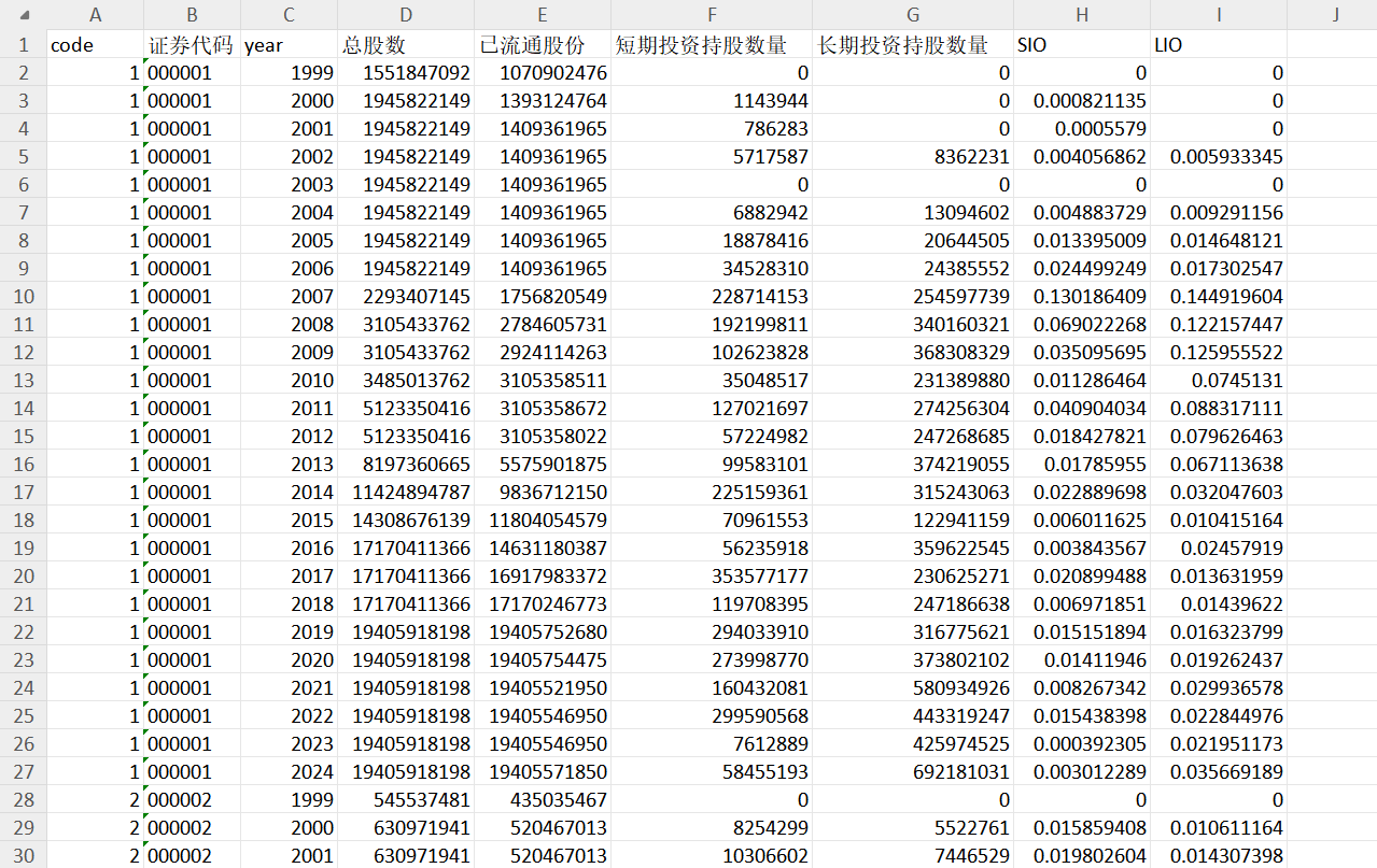 最后,对每只股票中的机构投资者类型分别计算长(短)期机构投资者持股比例,即每期的短期投资者持有股票的总和除以当期流通股总数量的比例表示短期机构投资者持有比例(SIO,Short-term institutional Ownership),同样计算长期机构投资者的持有比例(LIO,Long-term institutional Ownership)。