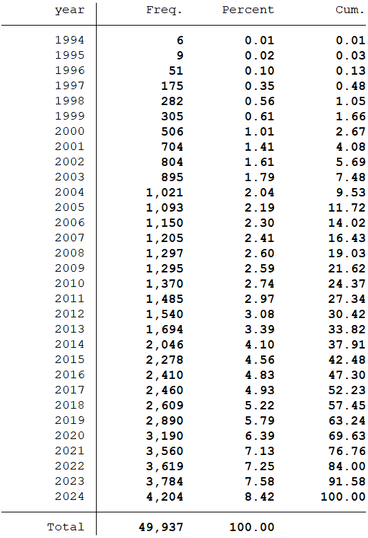 样本选择:全部A股1994-2024年数据(初始数据区间是1990-2024年,经过处理之后的数据区间为1994-2024年)
