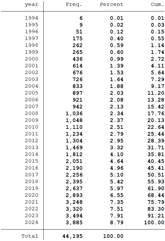 与参考文献相同,做了如下的剔除处理:(1) 被ST处理(2) 属于金融行业的(3) 关键变量缺失的上市公司(4)销售收入数据不足5年和销售收入小于0的公司