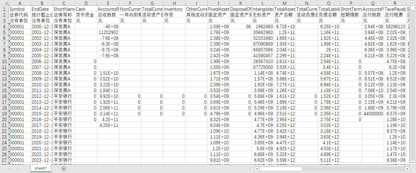 证券代码 统计截止日期 证券简称 货币资金 应收账款 一年内到期的非流动资产 流动资产合计 存货 其他流动资产 固定资产 固定资产清理 无形资产 资产总额 流动负债合计 负债总额 短期借款 应付账款 应付税费 应付股利 一年内到期的长期负债 所有者权益合计 股本 营业总收入 营业收入 营业总成本 营业成本 营业税金及附加 销售费用 管理费用 研发费用 财务费用 营业利润 营业外收入 营业外支出 利润总额 所得税费用 净利润 固定资产折旧、油气资产折耗、生产性生物资产折旧 无形资产摊销 长期待摊费用摊销 经营活动产生的现金流量净额 资产负债率 总资产报酬率A 总资产报酬率B 总资产报酬率C 总资产净利润率A 总资产净利润率B 总资产净利润率C 净资产收益率(ROE)A 净资产收益率(ROE)B 净资产收益率(ROE)C 市值A 市值B 账面市值比A 账面市值比B 每股收益 每股净资产 行业代码 行业名称 行业代码1 行业名称1