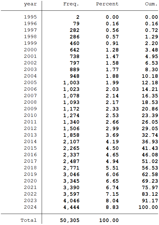 样本选择:全部A股1995-2024年数据(初始数据是从1990年开始,经过处理之后的数据起点为1995年)