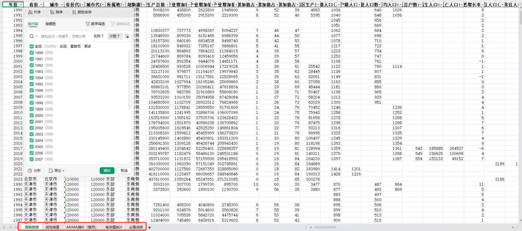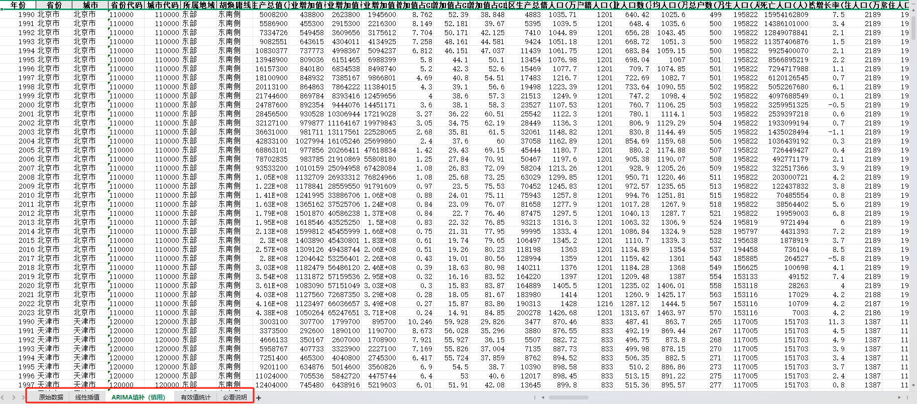 中国地级市面板统计数据库(包含四个页签:原始数据、线性插值、ARIMA填补、有效统计值四个页签)