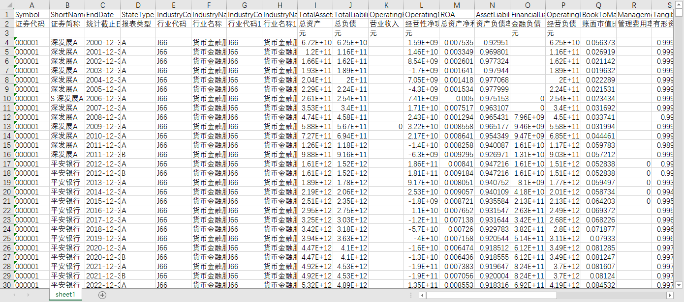 证券代码 证券简称 统计截止日期 报表类型 行业代码 行业名称 行业代码1 行业名称1 总资产 总负债 营业收入 经营性净现金流 总资产净利润率 资产负债率 金融负债 经营负债 账面市值比 管理费用率 有形资产比率 流动比率 存货周转率 营运资金周转率 现金及现金等价物周转率 营业收入增长率 非债务税盾 所得税率 盈利波动性 现金流波动性 利息覆盖率 税负 银行借款比例 短期借款依赖度 大股东占款