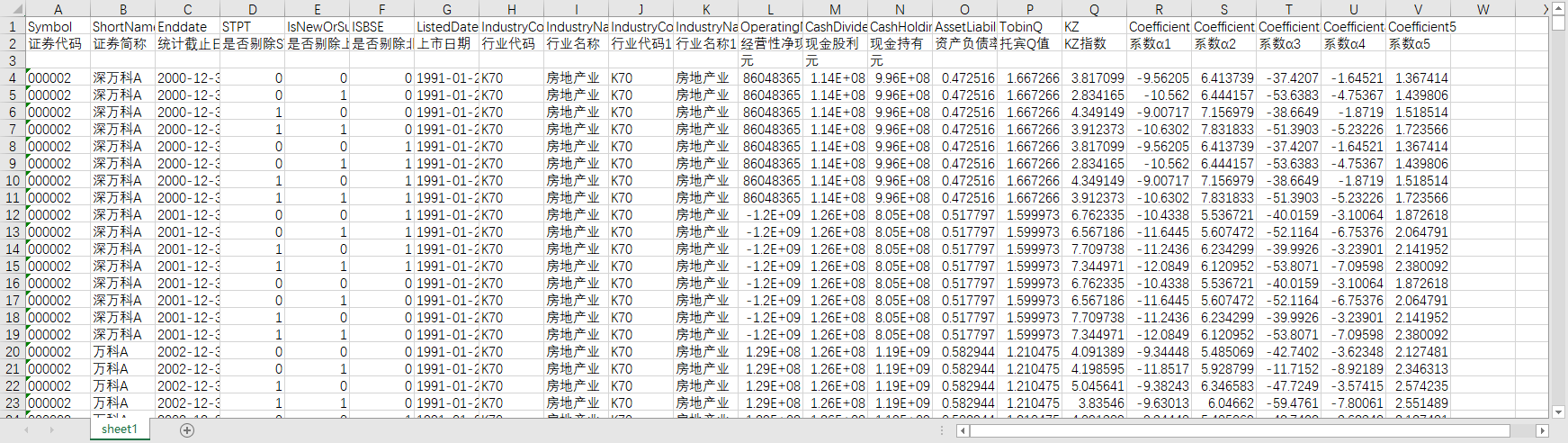 证券代码 证券简称 统计截止日期 是否剔除ST或*ST或PT股 是否剔除上市不满一年、已经退市或被暂停上市的公司 是否剔除北交所上市公司 上市日期 行业代码 行业名称 行业代码1 行业名称1 经营性净现金流 现金股利 现金持有 资产负债率 托宾Q值 KZ指数 系数α1 系数α2 系数α3 系数α4 系数α5