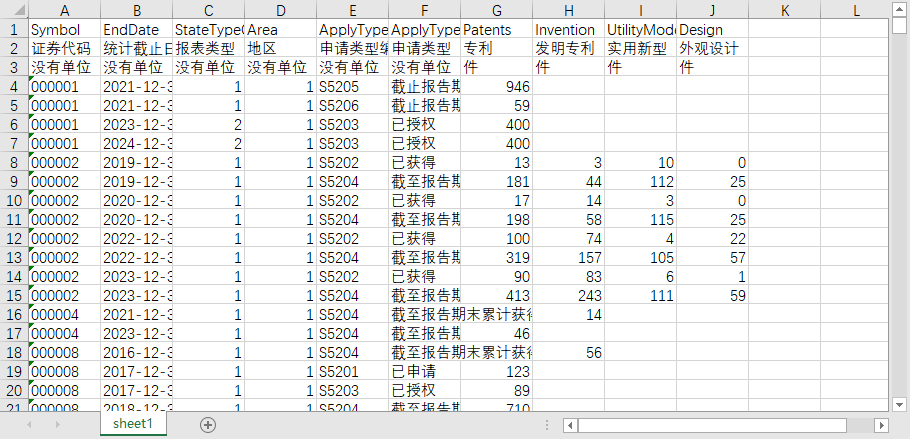 证券代码 统计截止日期 报表类型 地区 申请类型编码 申请类型 专利 发明专利 实用新型 外观设计