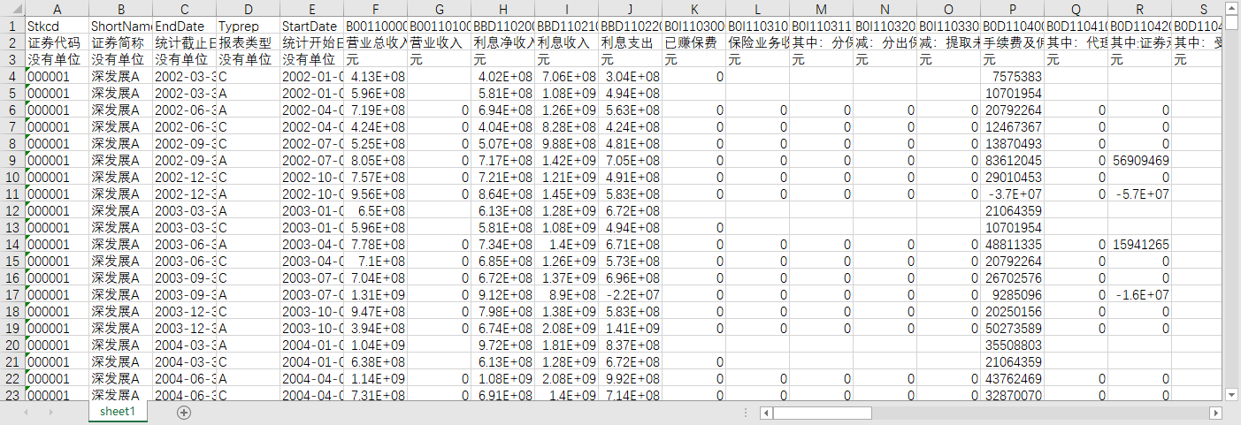 证券代码 证券简称 统计截止日期 报表类型 统计开始日期 营业总收入 营业收入 利息净收入 利息收入 利息支出 已赚保费 保险业务收入 其中:分保费收入 减:分出保费 减:提取未到期责任准备金 手续费及佣金净收入 其中:代理买卖证券业务净收入 其中:证券承销业务净收入 其中:受托客户资产管理业务净收入 手续费及佣金收入 手续费及佣金支出 其他业务收入 营业总成本 营业成本 退保金 赔付支出净额 赔付支出 减:摊回赔付支出 提取保险责任准备金净额 提取保险责任准备金 减:摊回保险责任准备金 保单红利支出 分保费用 保险业务手续费及佣金支出 营业税金及附加 业务及管理费 减:摊回分保费用 销售费用 管理费用 研发费用 财务费用 其中:利息费用(财务费用) 其中:利息收入(财务费用) 资产减值损失 其他收益 其他业务成本 公允价值变动收益 其中:以摊余成本计量的金融资产终止确认收益 投资收益 净敞口套期收益 其中:对联营企业和合营企业的投资收益 汇兑收益 信用减值损失 资产处置收益 其他业务利润 营业利润 营业外收入 营业外支出 其中:非流动资产处置净损益 其中:非流动资产处置损失 利润总额 所得税费用 未确认的投资损失 影响净利润的其他项目 净利润 持续经营净利润 终止经营净利润 归属于母公司所有者的净利润 归属于母公司其他权益工具持有者的净利润 少数股东损益 基本每股收益 稀释每股收益 其他综合收益(损失) 归属母公司所有者的其他综合收益的税后净额 归属于少数股东的其他综合收益的税后净额 综合收益总额 归属于母公司所有者的综合收益总额 归属于母公司其他权益工具持有者的综合收益总额 归属于少数股东的综合收益总额
