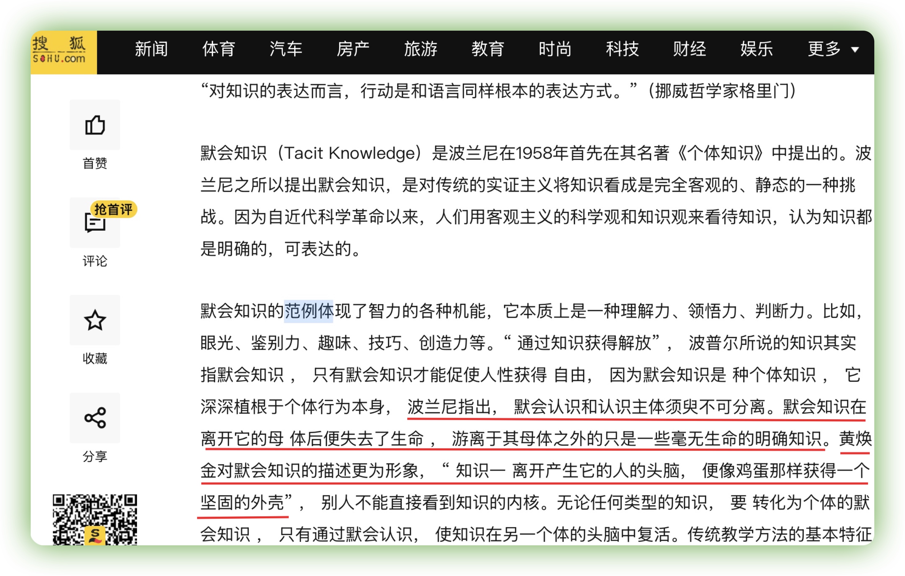 我讲:“知识—离开产生它的人的头脑,便像鸡蛋那样获得一个坚固的外壳”。它与哲学家波兰尼的思想不谋而合。这是我“知识运动学”里面的重要思想。对于教育来讲也是有重大意义的。