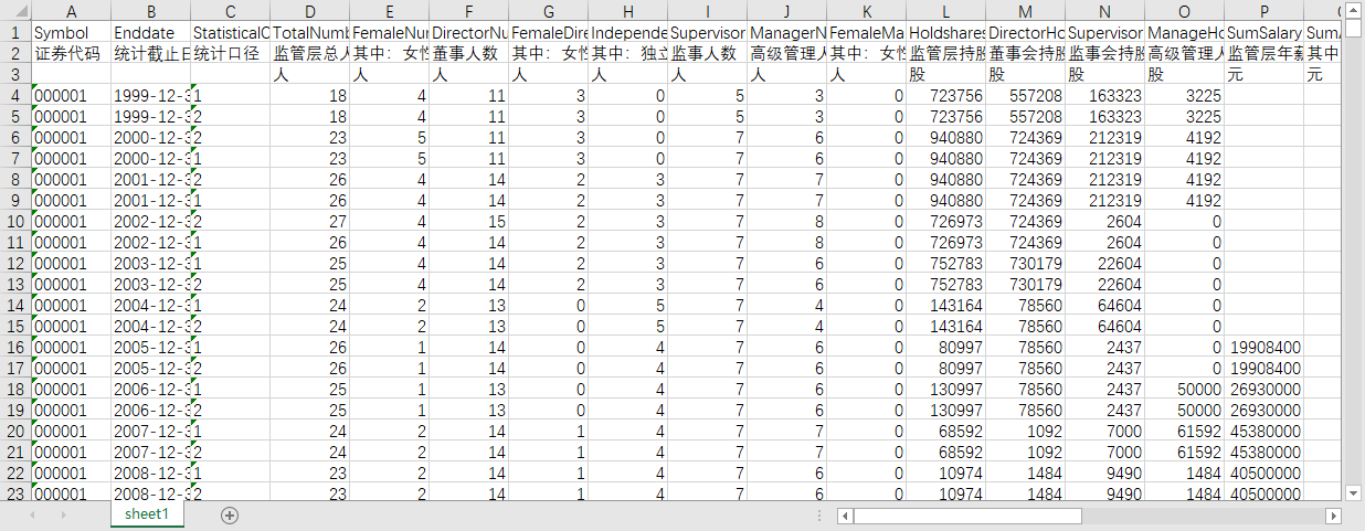 证券代码 统计截止日期 统计口径 监管层总人数 其中:女性监管层人数 董事人数 其中:女性董事人数 其中:独立董事人数 监事人数 高级管理人员数 其中:女性高级管理人员数 监管层持股数量 董事会持股数量 监事会持股数量 高级管理人员持股数量 监管层年薪总额 其中:监管层津贴总额 董事薪酬总额 监事薪酬总额 高级管理人员薪酬总额 监管层前三名薪酬总额 董事前三名薪酬总额 监事前三名薪酬总额 高级管理人员前三名薪酬总额 未领取薪酬监管层人数 其中:未领取薪酬董事人数 其中:未领取薪酬监事人数 监管层第一名薪酬 董事第一名薪酬 监事第一名薪酬 高级管理人员第一名薪酬 持有本公司股份的董事总人数 持有本公司股份的监事人数