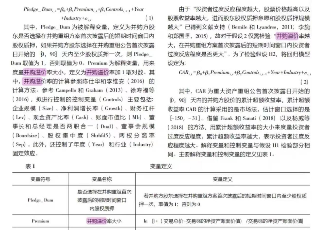 参考文献:[1]任力,何苏燕,并购溢价对股权质押时机选择影响的经验研究.会计研究,2020,(06):93-107.