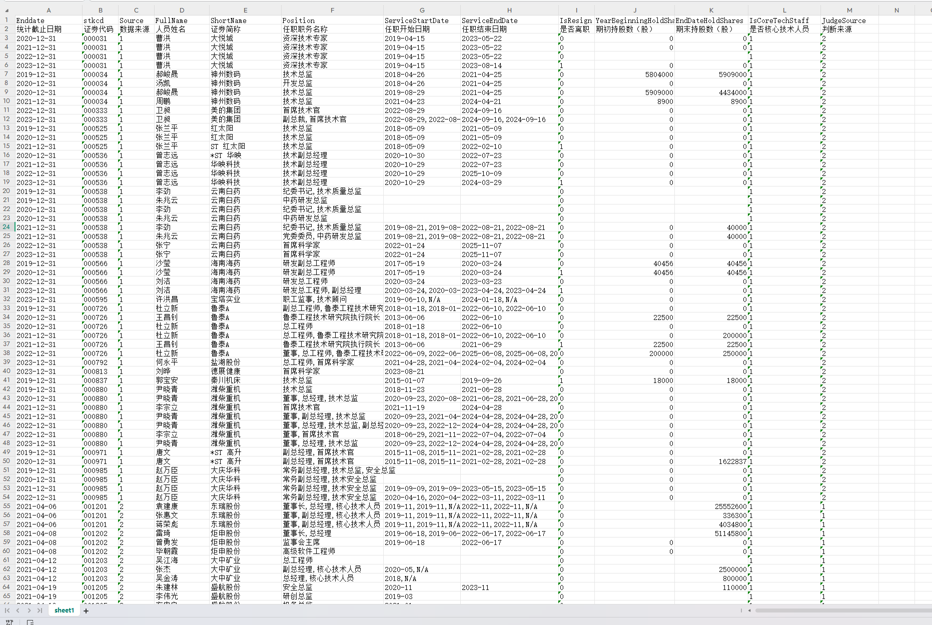 ▪ 数据说明:上市公司核心员工情况统计包括统计截止日期、证券代码、数据来源、人员姓名、任职职务名称、任职开始日期、任职结束日期、是否离职、期初持股数(股)、期末持股数(股)、是否核心技术人员、判断来源等变量。数据提供.dta和.csv两种格式,可用STATA或EXCEL打开。