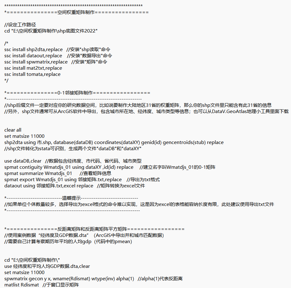 [color=rgba(0, 0, 0, 0.9)]可根据自己对需求生成权重矩阵(根据ArcGIS中导出的省份数据和经纬度数据),包含案例数据和Stata代码