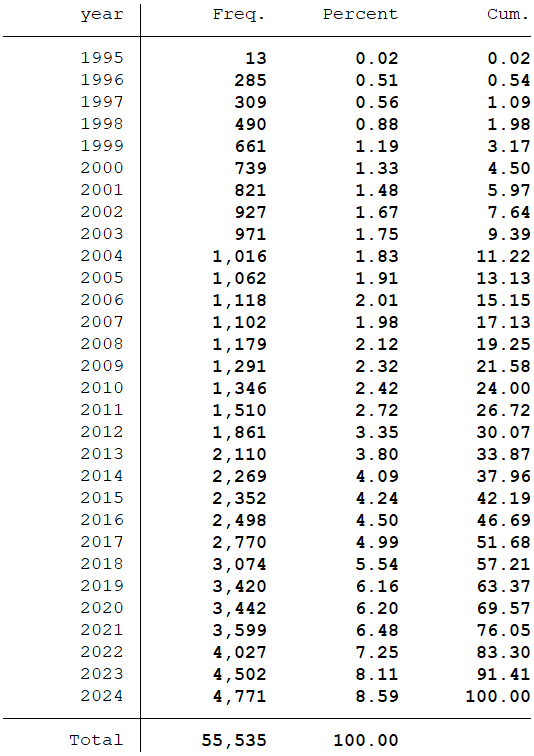 样本选择:全部A股1995-2024年数据(初始数据是从1990年开始,经过处理之后的数据起点为1995年)