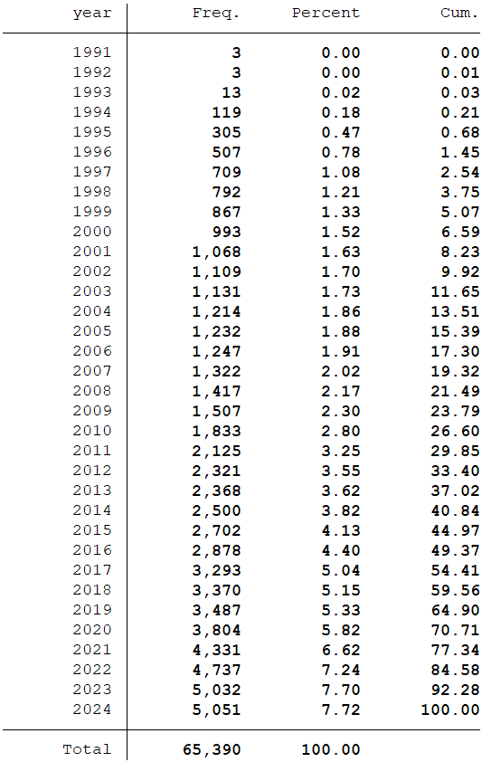 样本选择:全部A股1991-2024年数据(初始数据是从1990年开始,经过处理之后的数据起点为1991年)