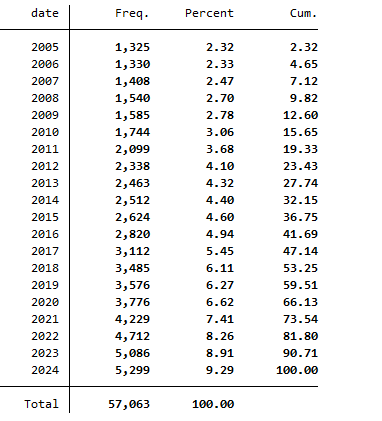 原始数据2001-2024年,处理过程中发现01-04有数据公布缺失,所以剔除了这几年保留了05-24年。