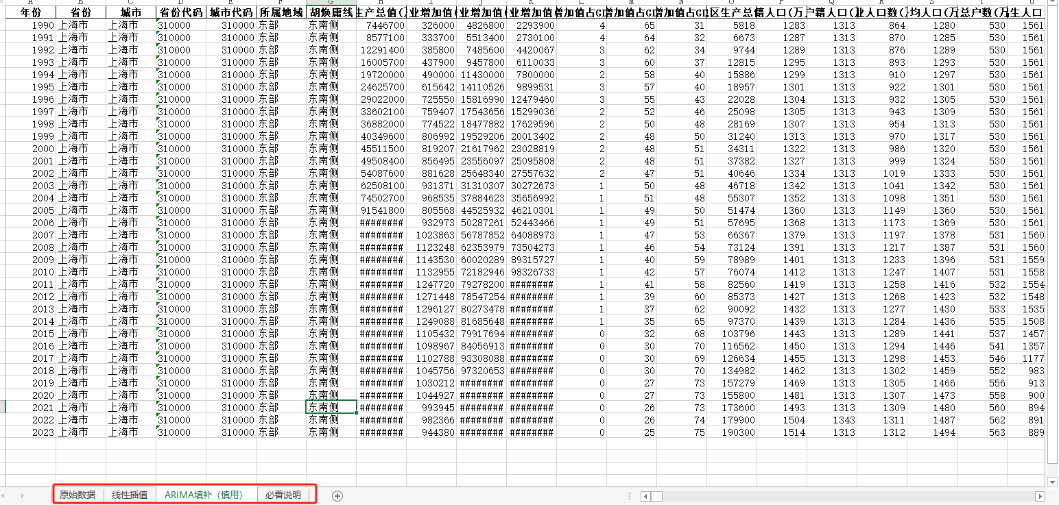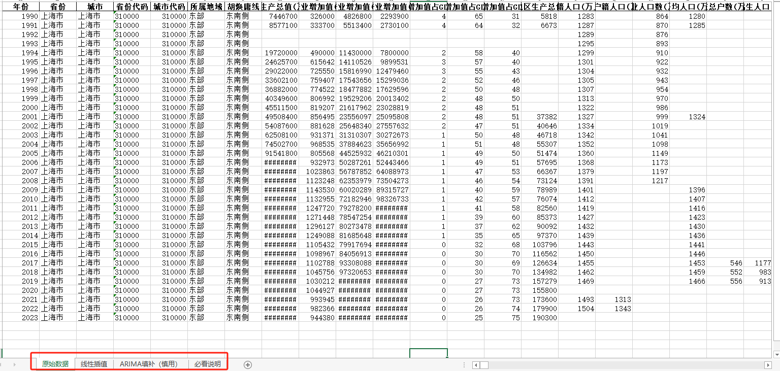 中国地级市面板统计数据库(包含四个页签:原始数据、线性插值、ARIMA填补、有效统计值四个页签)