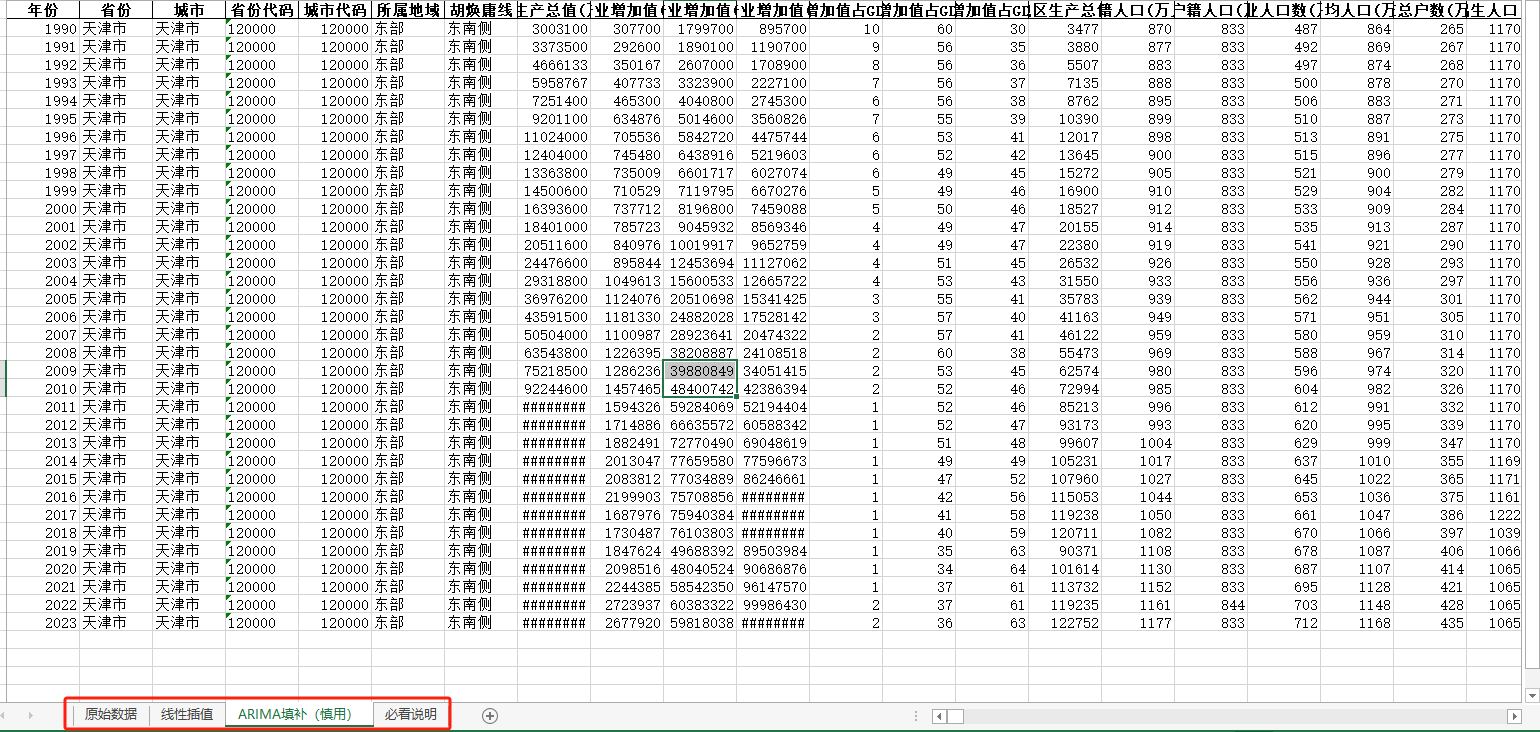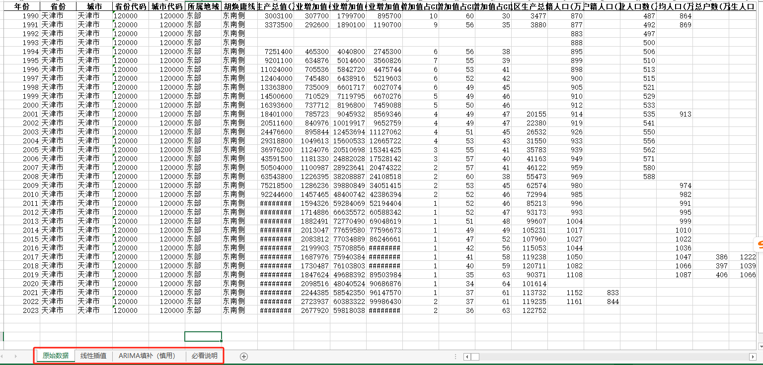 中国地级市面板统计数据库(包含四个页签:原始数据、线性插值、ARIMA填补、有效统计值四个页签)