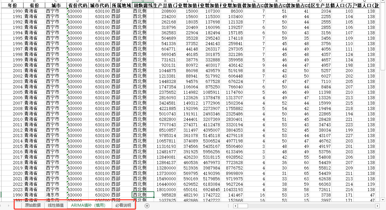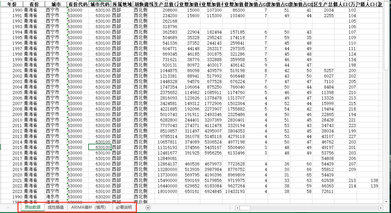 中国地级市面板统计数据库(包含四个页签:原始数据、线性插值、ARIMA填补、有效统计值四个页签)