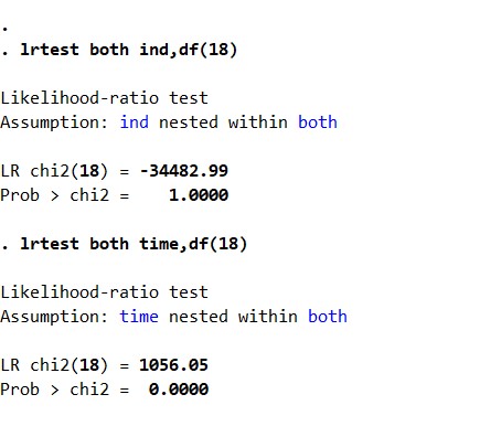 Stata LR检验中,根据显著性来看,显示应选择个体固定;但是如果根据AIC/BIC判断,显示选择双固定。后边实证分析中,时间固定效果更好,这是为什么呀??想问问大家该咋办