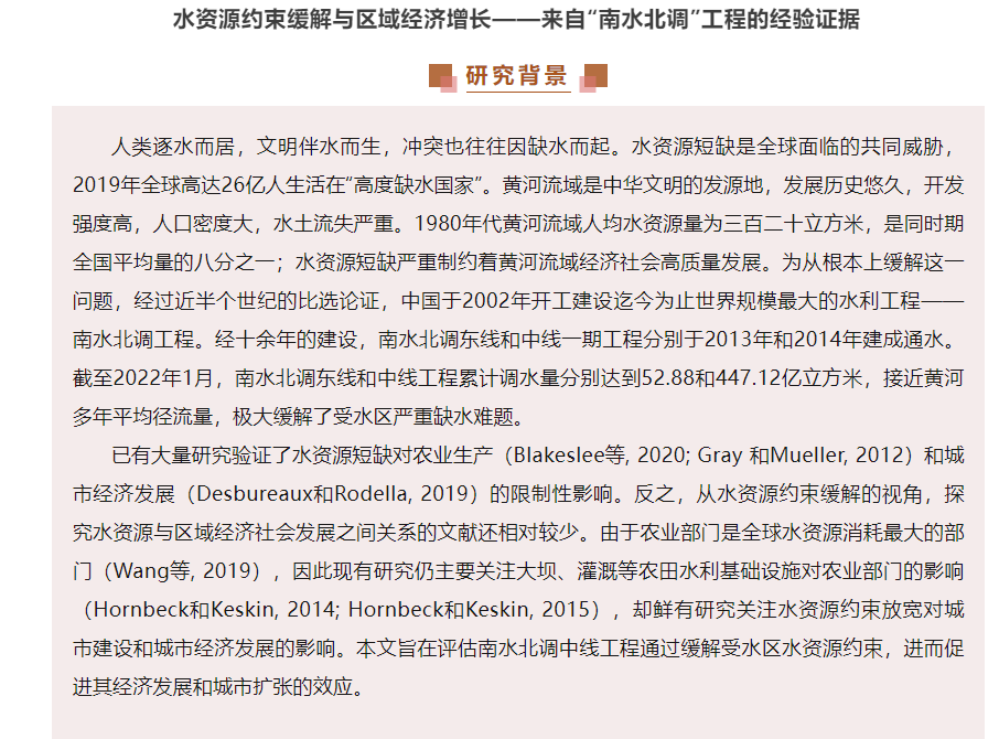 水资源约束缓解与区域经济增长——来自“南水北调”工程的经验证据