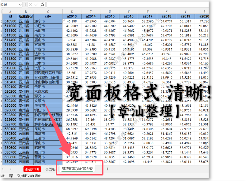 2.格式为excel,原始数据已整理为宽面板+长面板(含地区代码、所属省份),方便修改时间跨度和匹配数据,导入stata直接跑数据。
