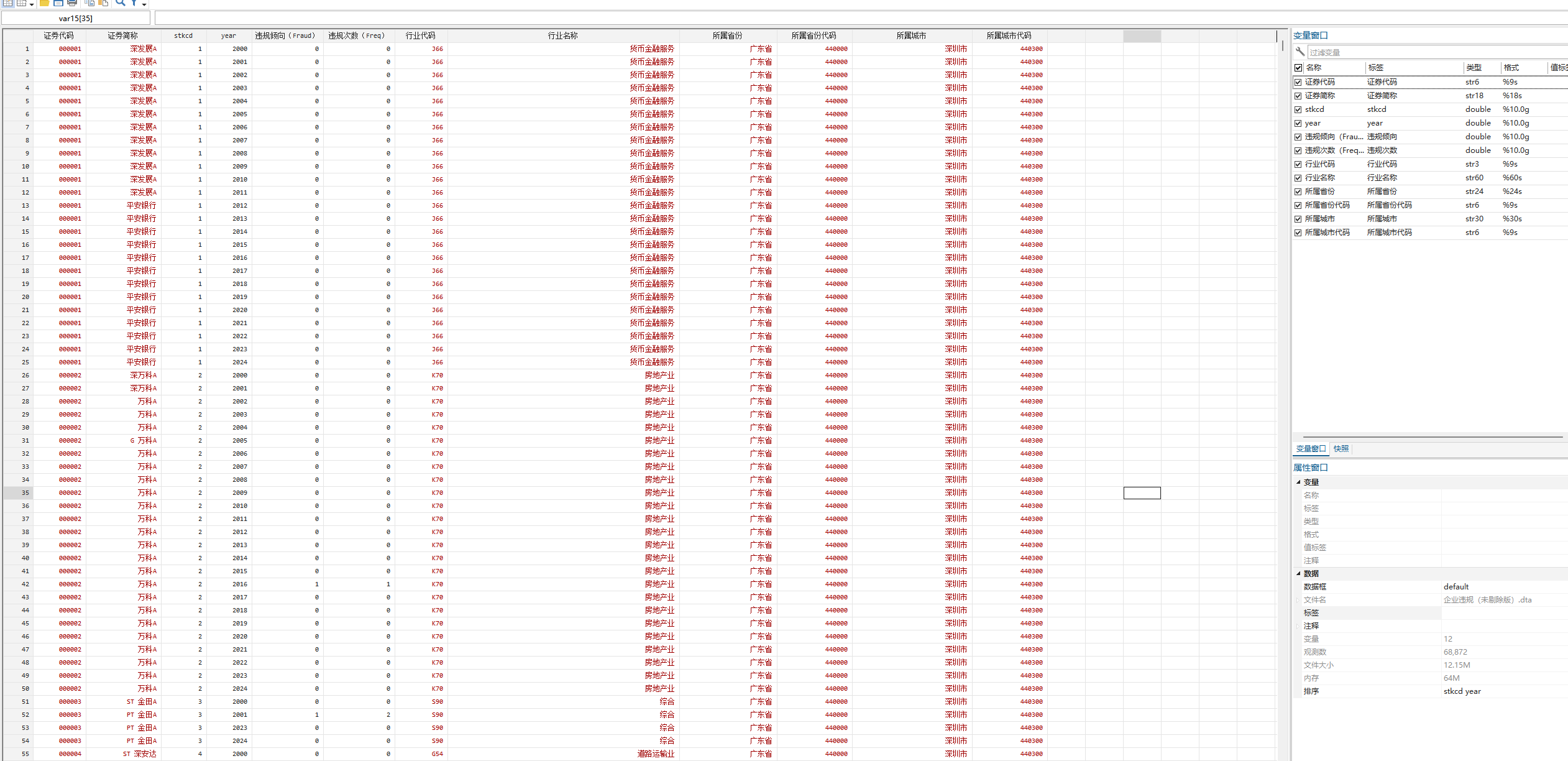 在数据库的违规处理字库中,违规数据是按照违规事件排列的截面数据,虽然数据中包括处理文件日期和公告日期,但是违规行为并不一定发生在被稽查当年,因此我们按照另一字段违规年度"将该数据整理为包含公司年度的面板数据。若公司在某一年度违规则违规倾向(Fraud)取值为1,否则为0。按照某一年份在某公司所有违规事件的"违规年度"中出现的次数,定义变量违规次数Freq。
